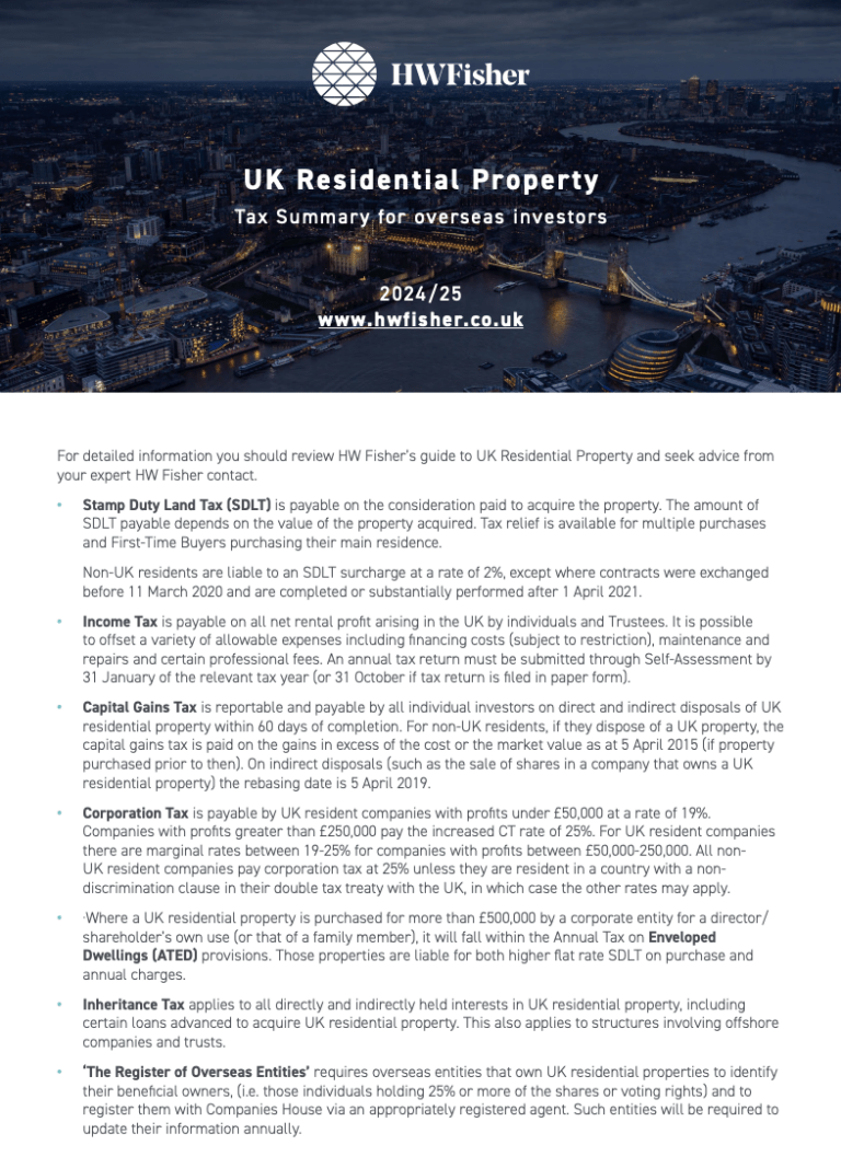 UK tax law affecting overseas owners of UK residential property has undergone rapid and significant change in recent years and it is important that new investors seek expert advice on their exposure to UK taxes.